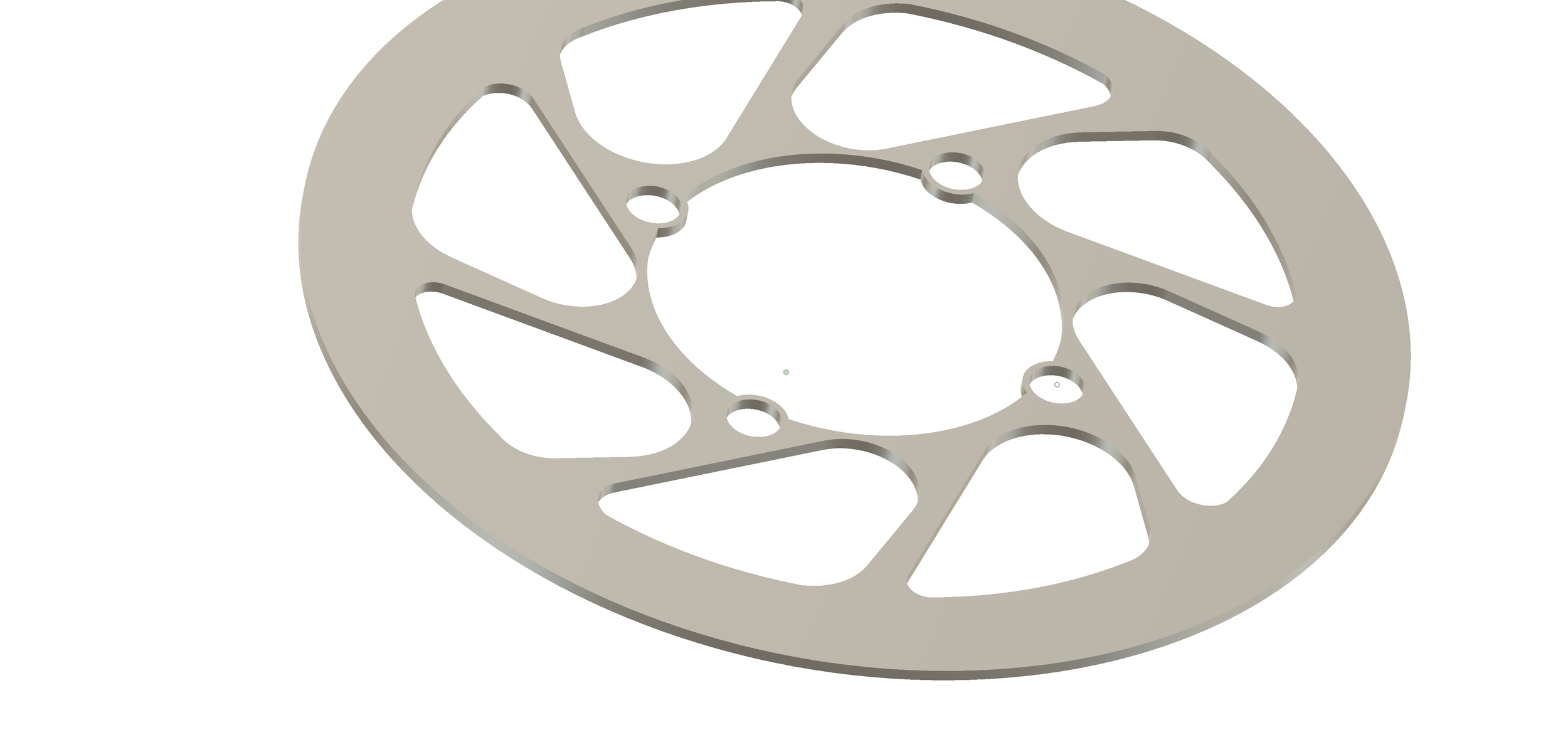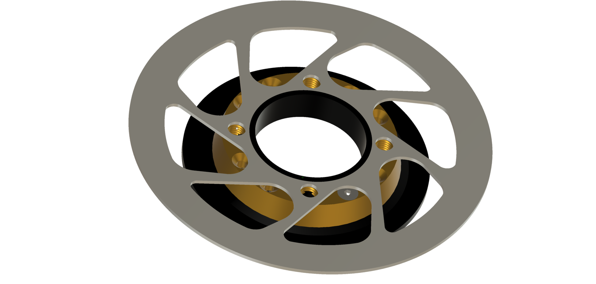 All that looks relatively promising, but if we look closer, we see that the M8 fasteners that hold the rotor to the ring do not have enough thread engagement (problem area circled in red).