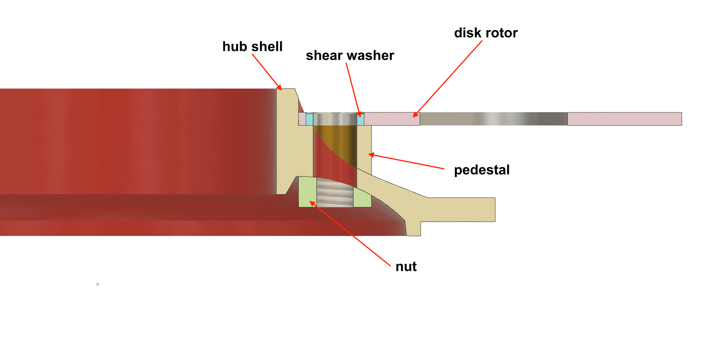 The two images above show a potential solution to mounting the pedestal. We tap the hub end cap (in this case M8 to match the rotor holes) and the pedestal just has a through hole. We can then use the fixing hardware that attaches the rotor to also attach the pedestal. While this looks like it could be a solution, you can see on the outside/lower part of the hub end cap, we only have a couple of threads due to the thin wall on on this part of the shell. I suspect that would be very easy to strip. I don’t think this is going to work.